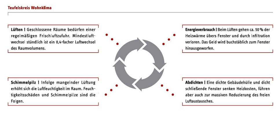 Moderne Häuser mit effizientem Wärmeschutz oder auch Altbauten mit nachträglich durchgeführten Wärmedämm-Maßnahmen, sind so abgedichtet, dass ein natürlicher Luftaustausch nicht mehr stattfinden kann und eine kontrollierte Wohnraumlüftung deshalb unverzichtbar ist.